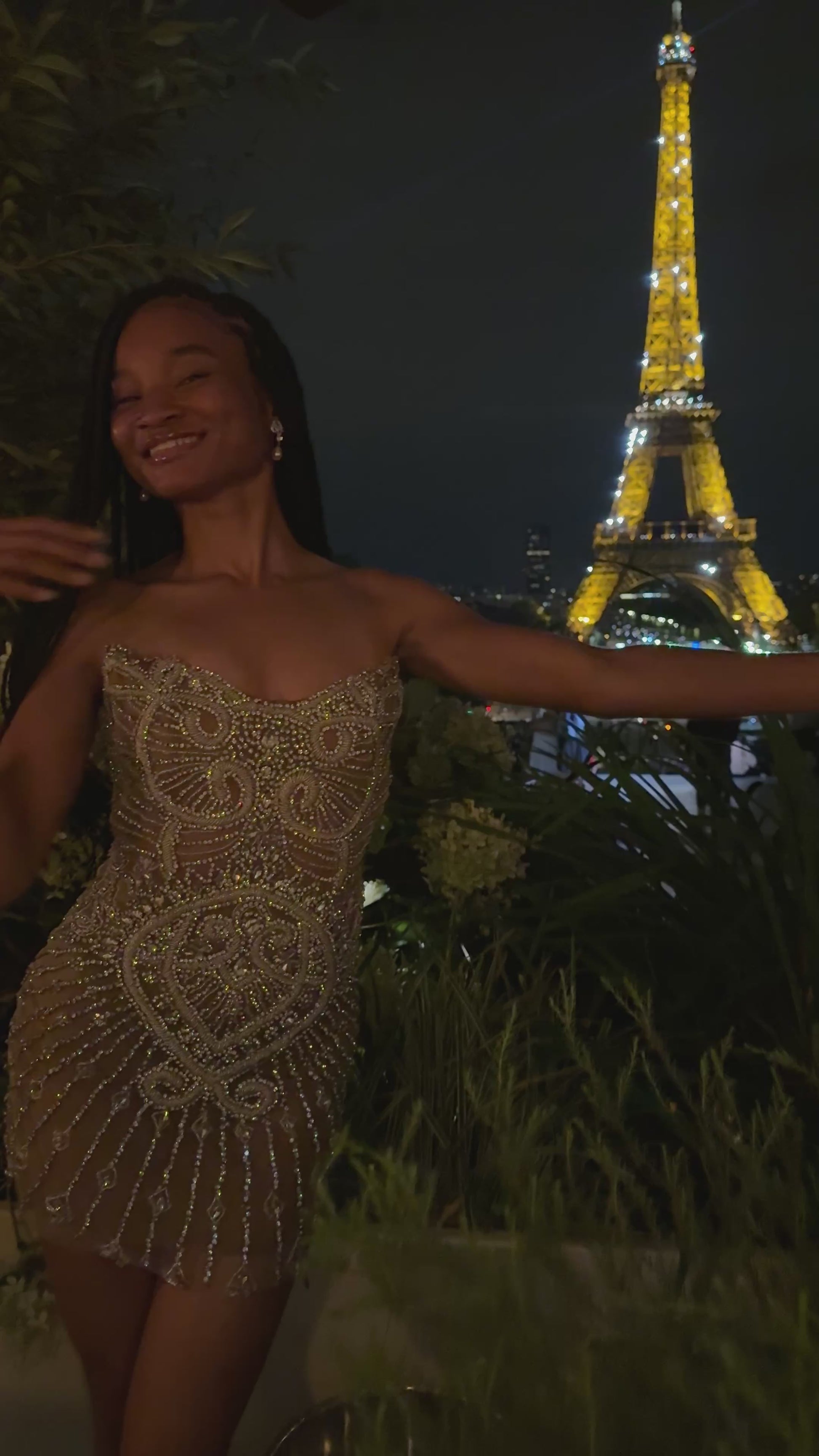 Designed and worn for a dream moment in Paris, the Paris Dress is our new signature silhouette: bold, feminine, and unforgettable. Featuring a sculpted corset bodice, hand-applied embellishments, and a luxurious, curve-contouring fit, this piece was created to stand where elegance meets artistry.